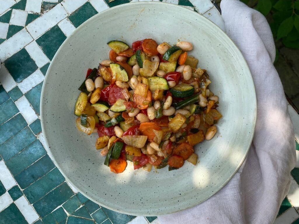 - Öl in einer Pfanne erhitzen. Gemüse in folgender Reihenfolge in die Pfanne geben: Sellerie und Möhren 3-4 Minuten braten, dannFrühlingszwiebeln, Zwiebeln und Zucchini dazugeben und 3-4 Minuten braten,Bohnen und Tomaten zuletzt in die Pfanne geben, das Gericht mit Ras-el-Hanout, Salz und Pfeffer würzen, Temperatur reduzieren und noch ca. 4 Minuten bei schwacher Hitze weiter garen.