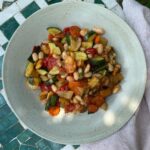 - Alle Gemüse mit Ausnahme der weißen Bohnenin in mundgerechte Stücke schneiden (siehe Foto). Auch die Zwiebeln sollen nicht klein gewürfelt werden, sondern eine ähnliche Größe haben wie die anderen Gemüse. Weiße Bohnen in einem Sieb kurz abtropfen.