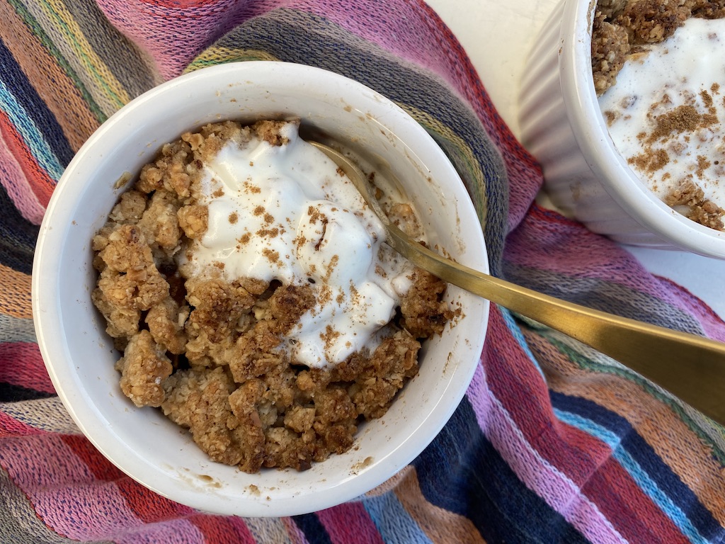 Sobald die Tage etwas kühler werden, gibt es bei uns z.B. nachmittags nach einem Spaziergang oder auch abends zur Serie auf dem Sofa wieder öfter ein warmes Zimt-Crumble. Wenn ich spontan Lust auf was Süßes bekomme, möchte ich meinen Heißhunger immer am liebsten sofort befriedigen. Die Energie für einen aufwändigen Teig kann ich dann meist nicht mehr aufbringen. Viele Kuchen haben außerdem eine recht lange Backzeit. Auch hierfür fehlt mir bei einer akuten Heißhungerattacke auf Süßes die Geduld.