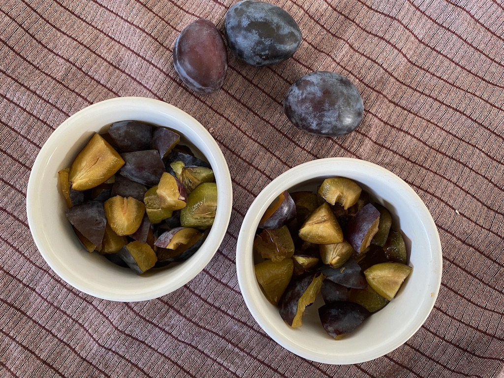 - Zwetschgen (oder anders Obst) waschen, abtrocknen, in kleine Stücke schneiden und in die Auflaufform geben. Das Förmchen sollte ungefähr zu 2/3 mit Obst gefüllt sein.