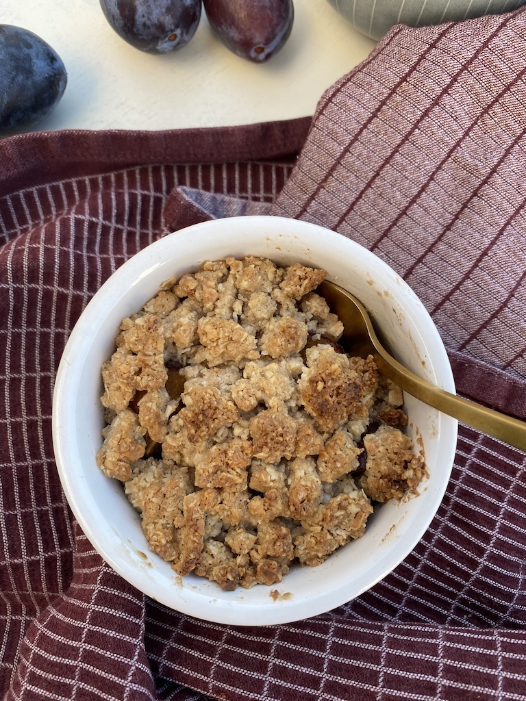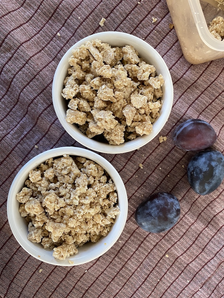 Im Spätsommer und Herbst verwende ich für mein Crumble gerne Heidelbeeren oder Zwetschgen wie hier auf dem Foto. Wenn deren Saison langsam zu Ende geht und wir uns dem Winter nähern, passen Äpfel und Birnen perfekt ins Crumble, im Frühjahr z.B. Rhabarber. Nehmt einfach das Obst, das zur jeweiligen Jahreszeit regional erhältlich ist oder das ihr sowieso gerade da habt. Crumble eignet sich auch prima für die Resteverwertung. Überreifes Obst, das man roh nicht mehr so gerne isst, macht sich im Crumble immer noch gut!